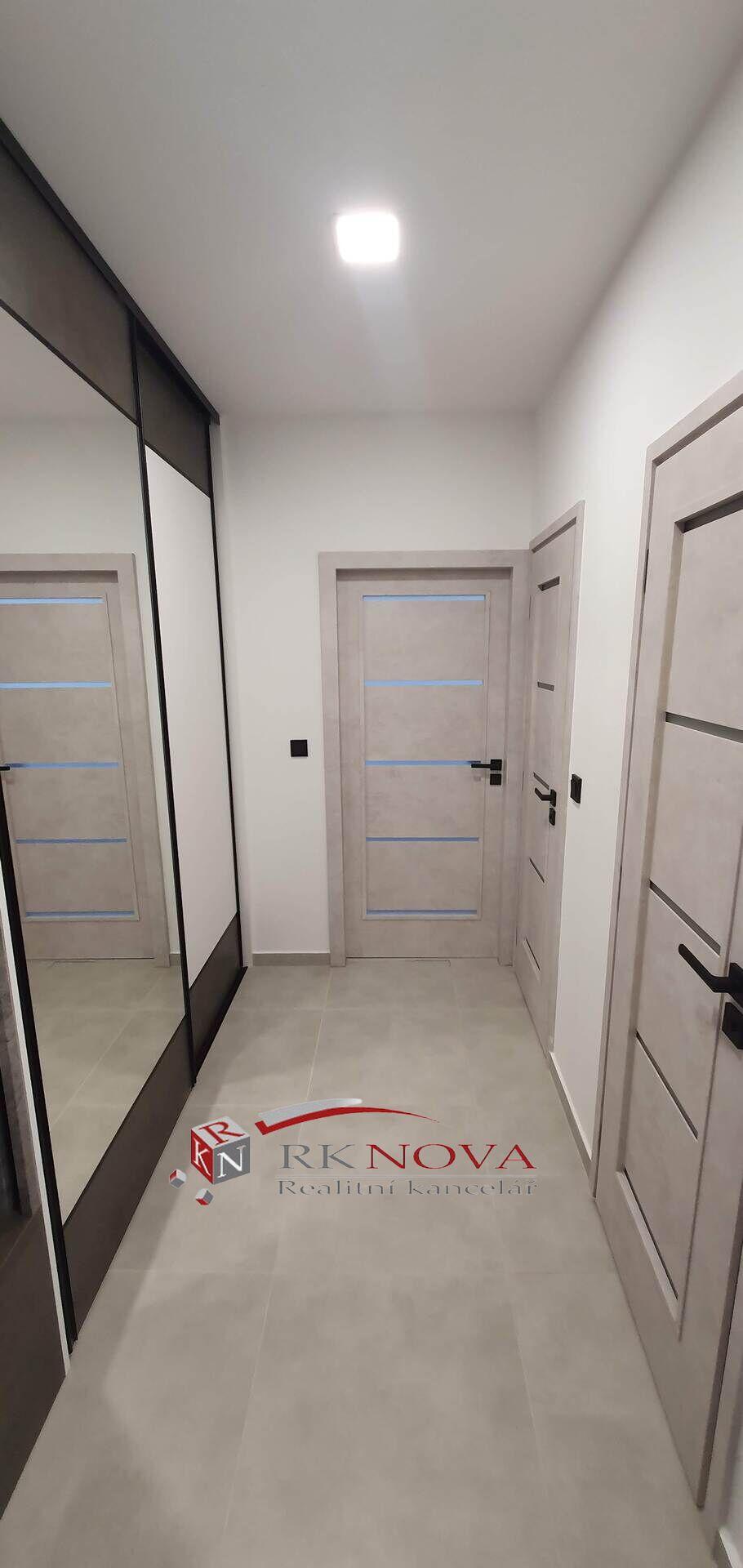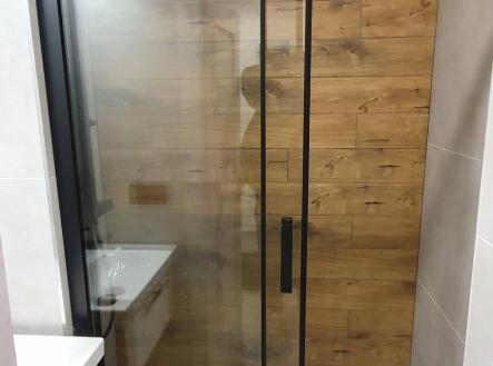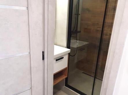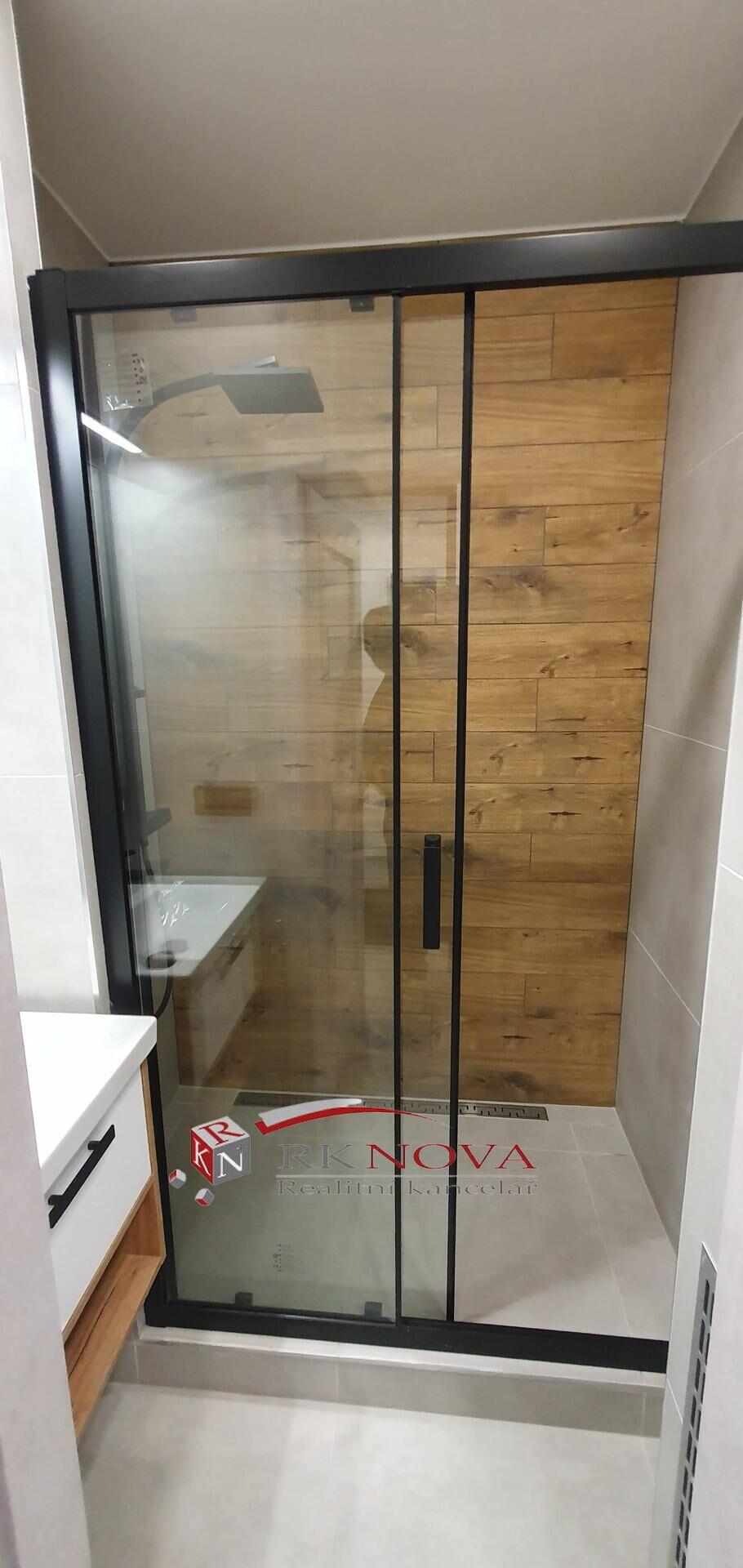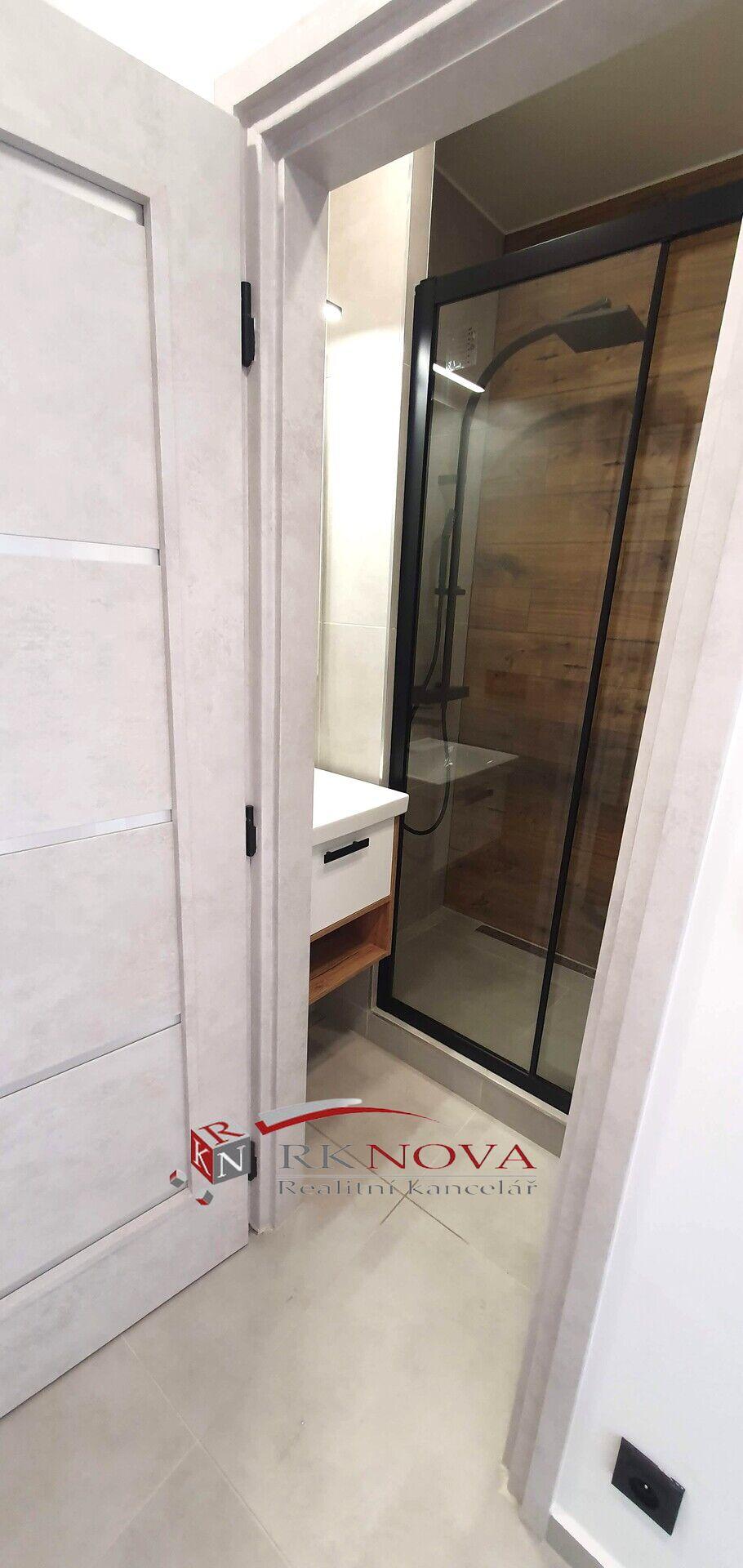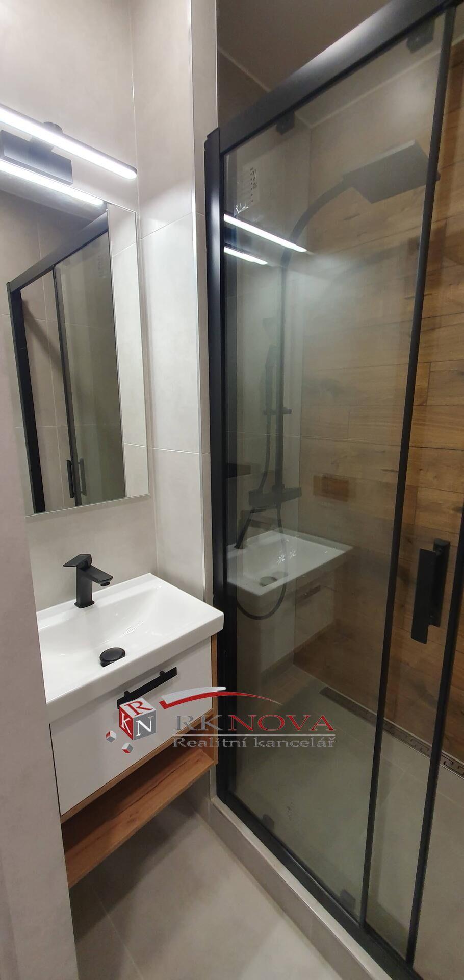 Nová koupelna z kvalitních materiálů po celkové rekonstrukci včetně nových rozvodů vody, nový sprchový kout s novou baterií, nové umyvadlové závěsné skřínky včetně keramického umyvadla s kvalitní pákovou baterií, nové zrcadlo s led osvětlením, nová ventilace.