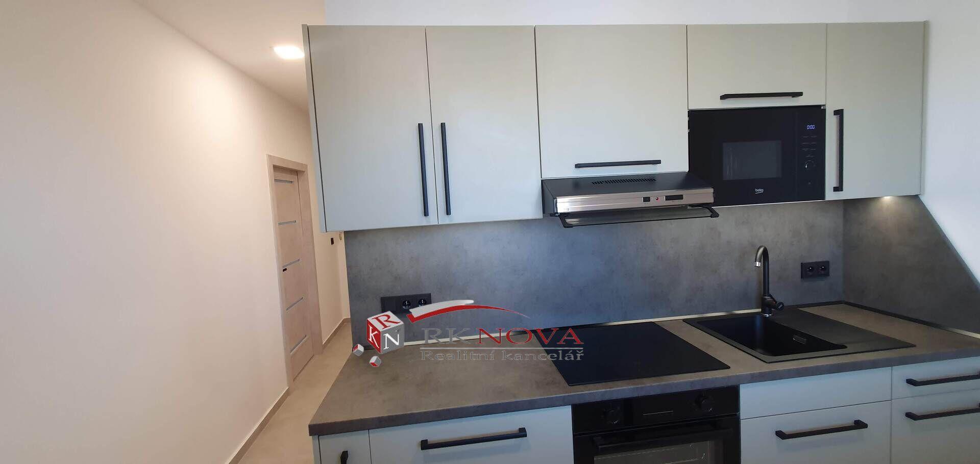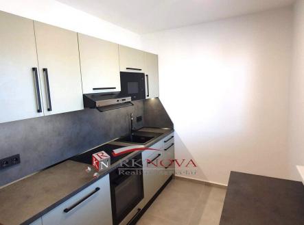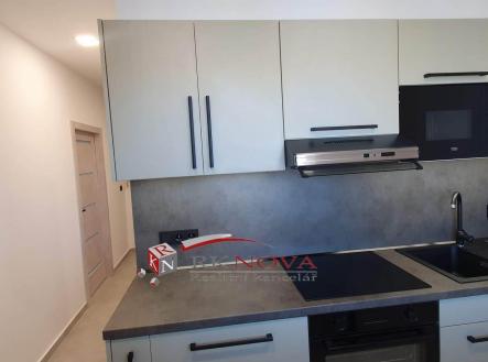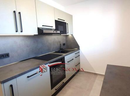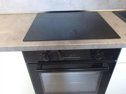 V bytě je nová kuchyňská linka na míru včetně vestavných značkových spotřebičů, a to: vestavné sklokeramické varné desky, vestavné multifunkční trouby, vestavné mikrovlnné trouby a digestoře s led osvětlením.