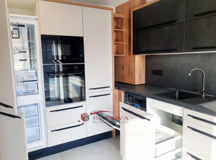 Dispoziční koncept 1.nadzemního podlaží domu nabízí 2 samostatné pokoje a obývací pokoj propojený s kuchyní, ve které se nachází moderní vestavná kuchyňská linka s vestavěnými značkovými spotřebiči, a to: vestavná indukční varná deska, vestavná multifunkční trouba, vestavné mikrovlnná trouba, vestavný digestoř s led osvětlením, integrovaná vestavná myčka, dřez FRANKE s odkapávačem, vestavná kombinovaná lednice.